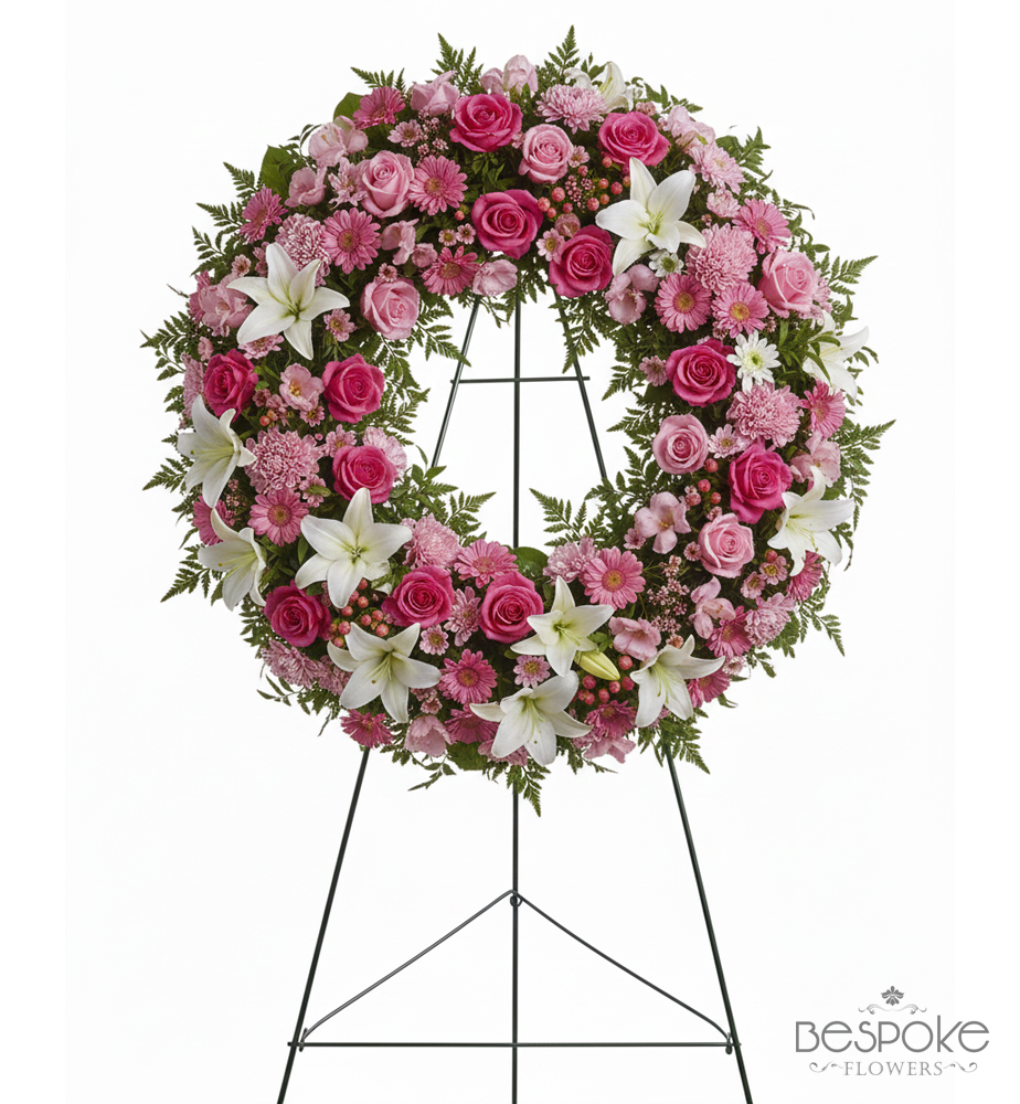 This exquisite circular wreath offers a soft and comforting tribute, combining the gentle beauty of pink tones with the classic purity of white blooms. It is a heartfelt expression of sympathy, designed to bring a sense of peace and grace to any memorial service.