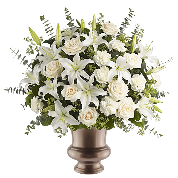 This elegant, large sympathy arrangement is an impressive mix of white oriental lilies and crème/white roses, presented in a beautiful urn vase.