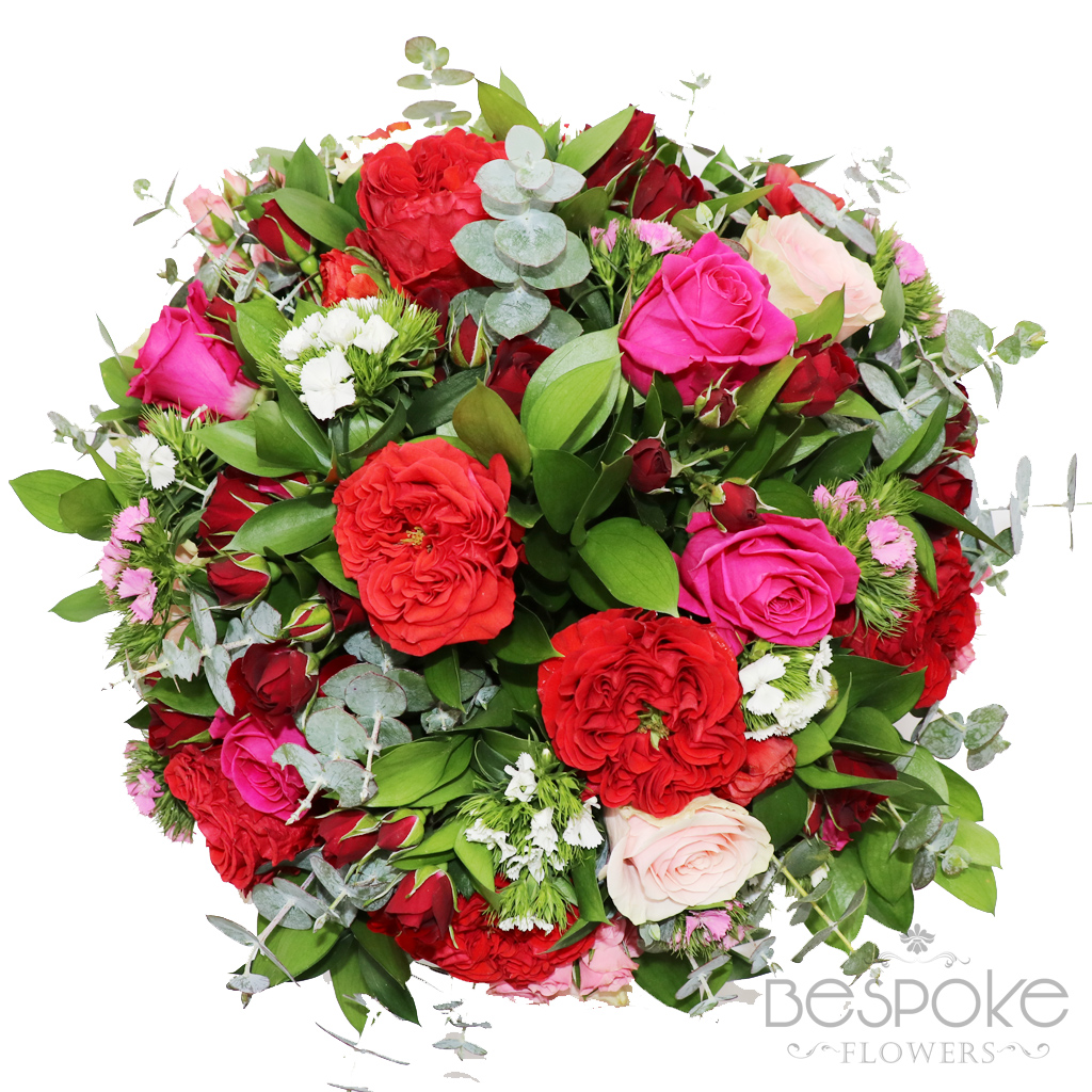 A luxurious display including red, pink and hot pink roses. As welll as garden roses, ranunculus, spray roses, sweet Williams and assorted greens.