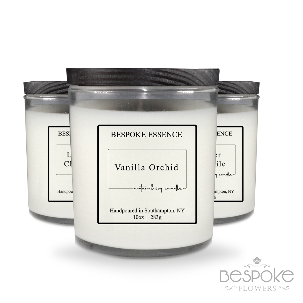 Experience tranquility with our 10oz Soy Wax Candles from Bespoke Essence. Hand-poured in Southampton, NY, with premium soy wax and infused with the soothing scents, this candle creates a serene and calming atmosphere in any space. Its 100% natural and clean, even burn ensures hours of aromatic bliss, making it the perfect addition to your floral arrangement.