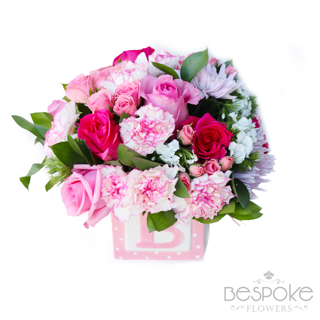 New Baby Girl Bloom is the perfect way to send your happy wishes to the new family! Blooming with blushing pink blooms to welcome the little princess into the world, this gorgeous flower bouquet brings together pink roses, pink carnations, pink mini carnations, white traditional daisies, wax flower and lush greens to create a memorable gift. Presented in a pink ceramic cube with the letter “B” written on the front, this fresh flower arrangement is a wonderful way to send your congratulations to friends and family at this joyful time in their lives.