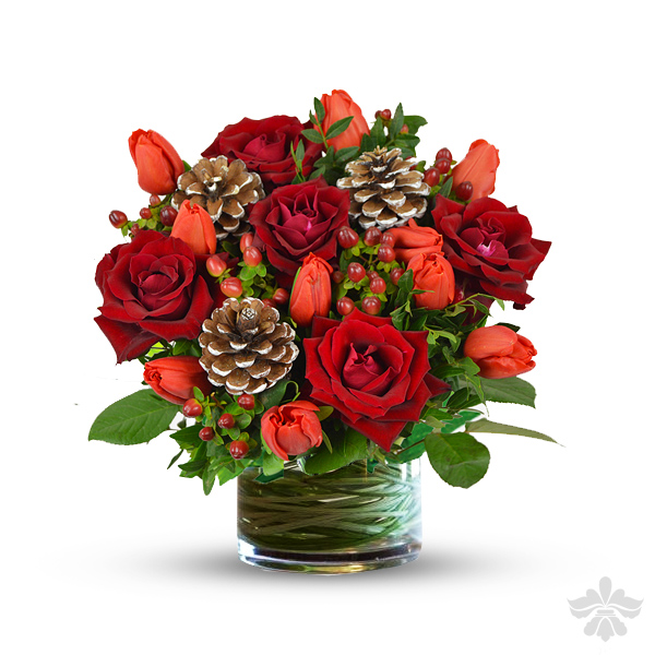 Each bouquet is arranged with festive red roses, red tulips with hypericum, Christmas pine cones, a gorgeous floral arrangement ideal to send to family and friends.