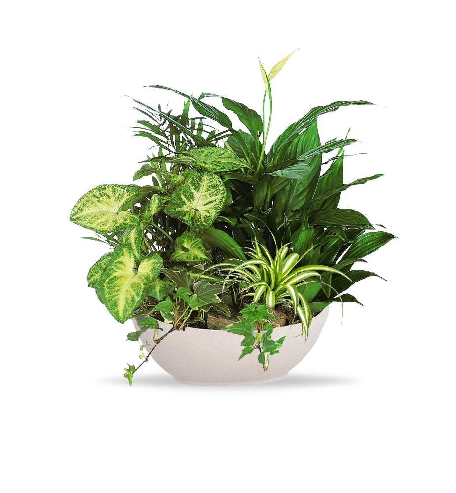 One planter arrives filled with dracaena, ivy, palm, spathiphyllum and syngonium plants.