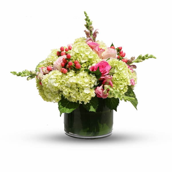 Arrangement of green hydrangeas, pink roses and spray roses, pink hypericum, snapdragons.