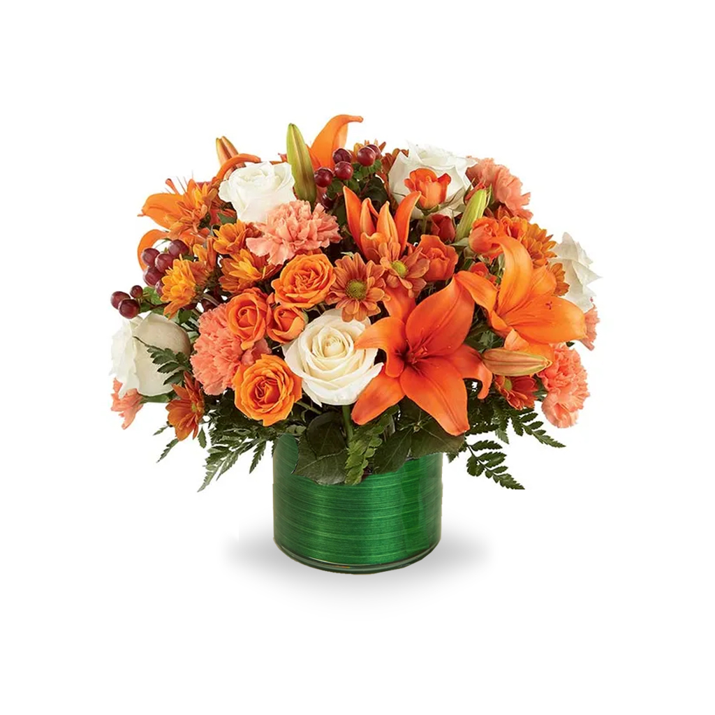 An elegant bouquet of beautiful white and orange roses, orange lilies, hypericum, spray roses, beautifully displayed in a green cylinder vase lined with aspidistra leaves.