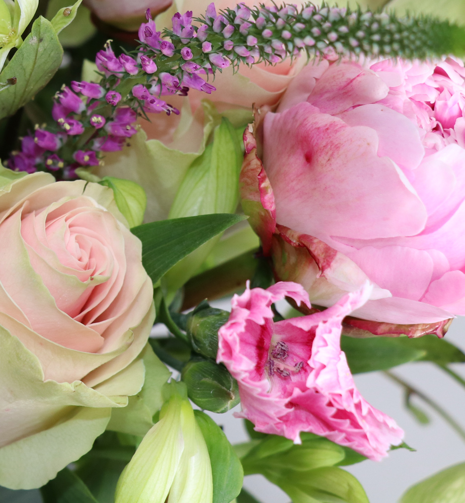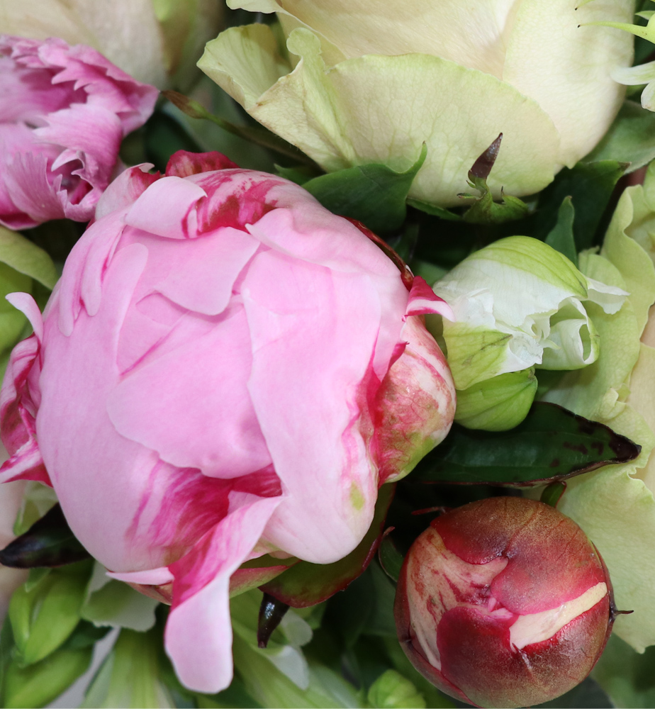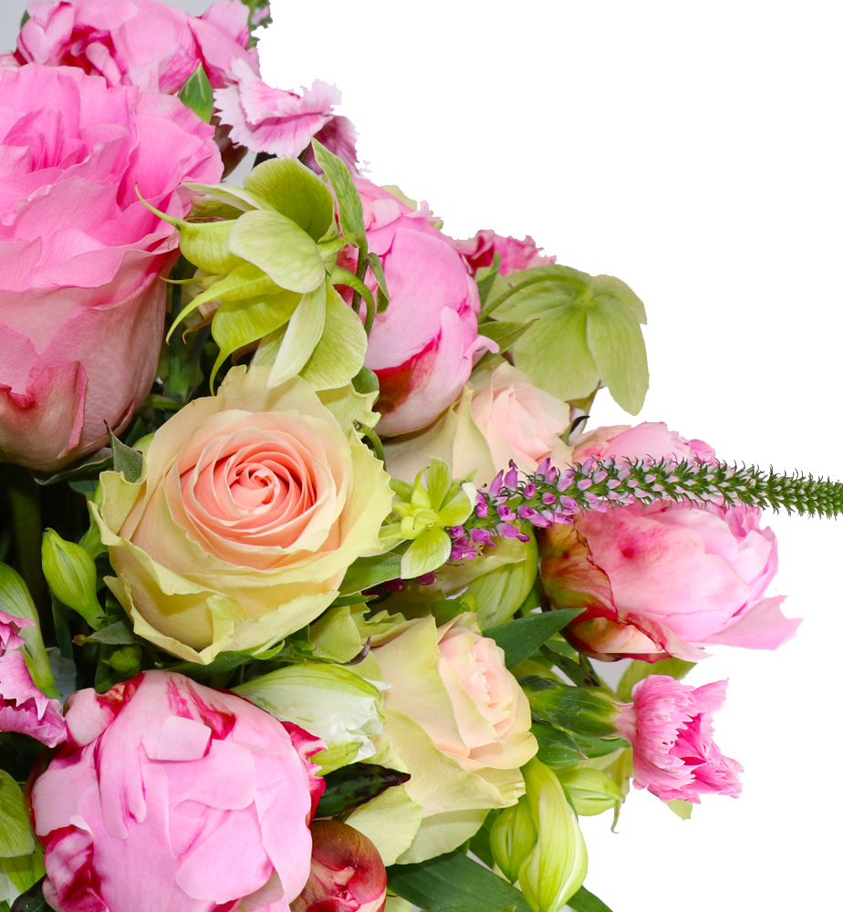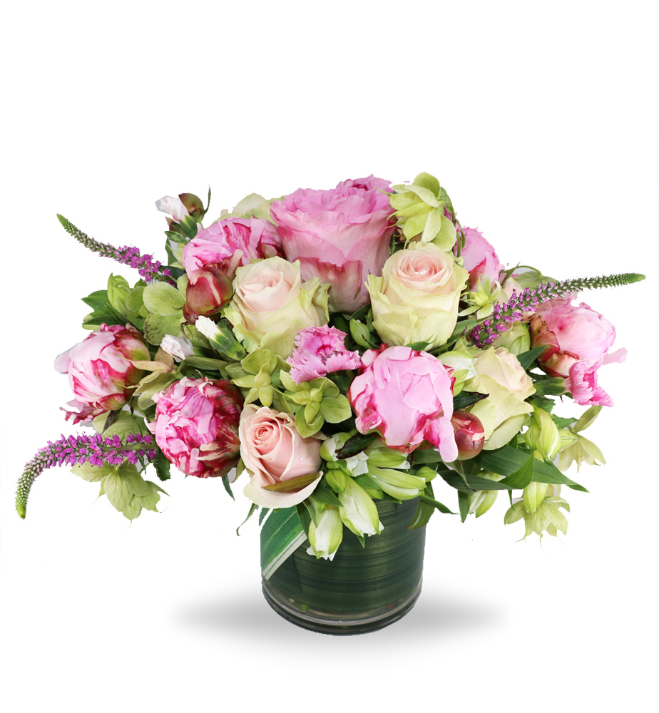 This elegant floral arrangement features a stunning combination of pink peonies Sarah Bernhard, Pink Roses, Pink Veronicas all beautifully complemented by the soft silvery hues of hellebores and alstromerias. The flowers are arranged in a sleek, leaf-lined glass cylinder vase, adding a modern yet organic touch to the design.