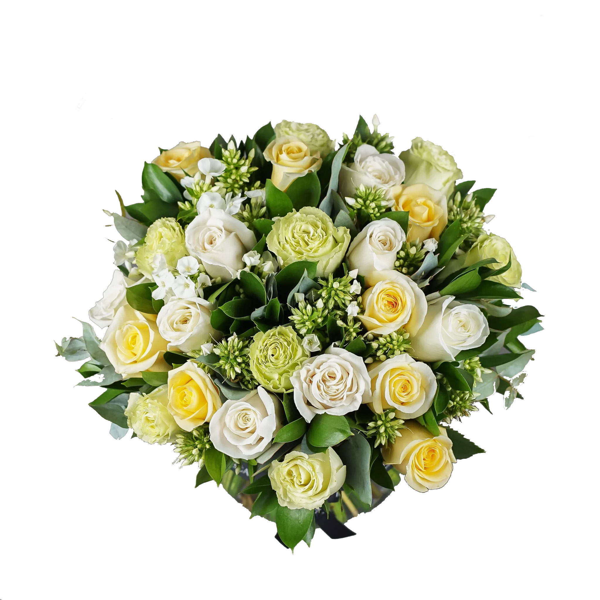 A luxurious display of fresh summer vibes flowers, this bouquet includes various white, green and cream roses and delicate phlox flowers beautifully arranged with seasonal foliage in an 8inch wide glass vase.