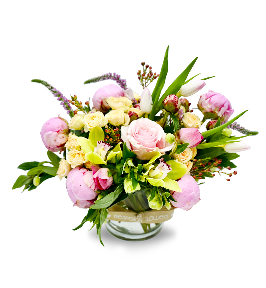 This beautiful arrangement is crafted in a cylinder vase with Peonies, helleborus, roses, spray roses, veronicas, cymbidium orchids and tulips mixed with waxflowers to serve as a thoughtful reminder of your care and love.
