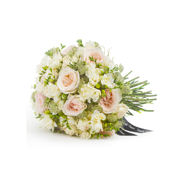 This Princess bouquet combines a beautiful mix of white David Austin Roses, fragrant freesia and seasonal foliage, an exquisite gift for a loved one