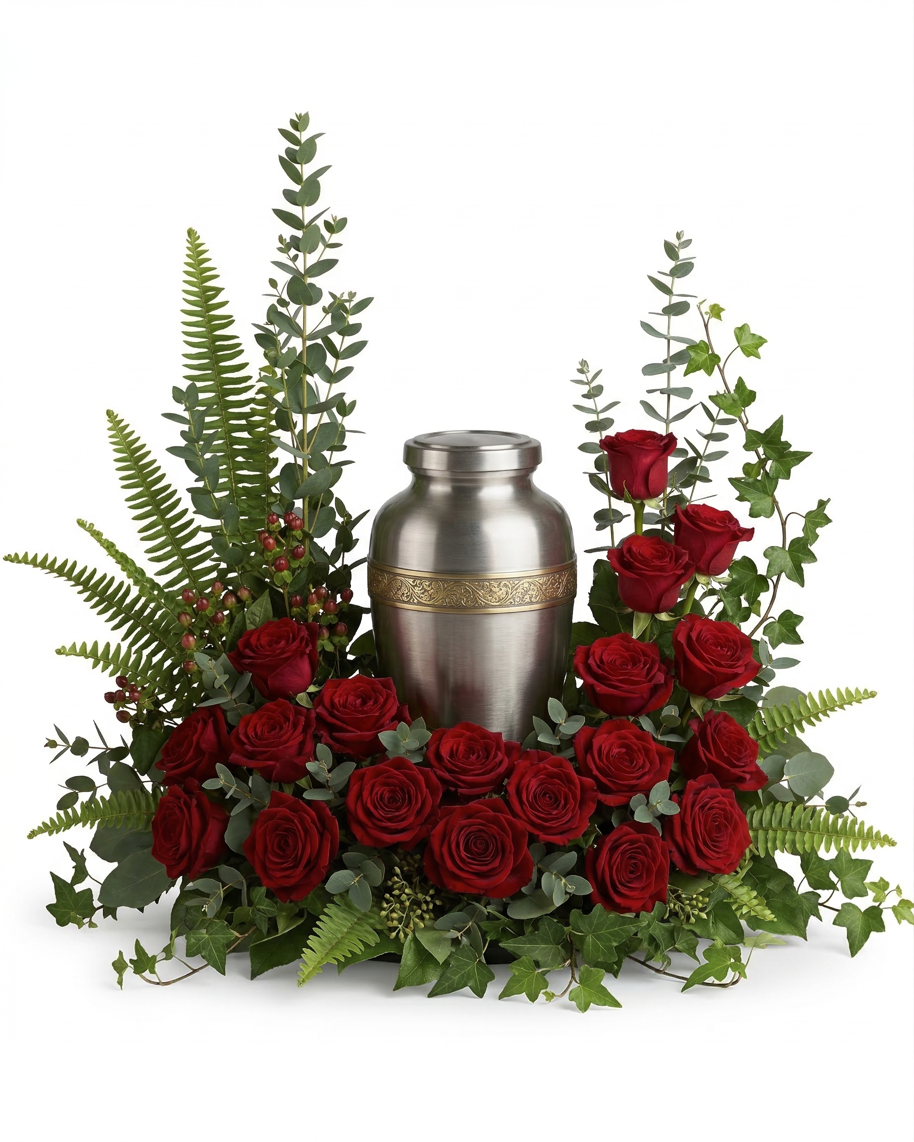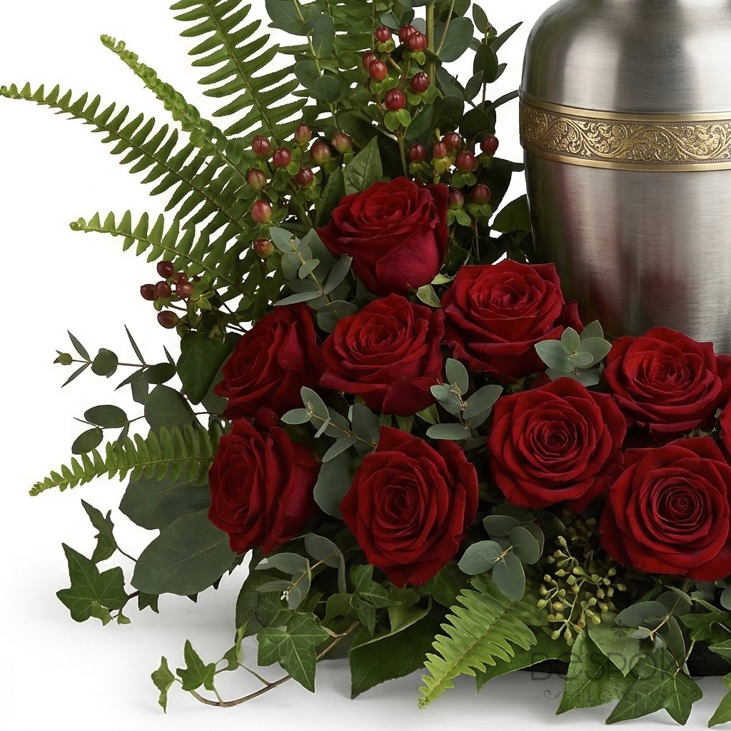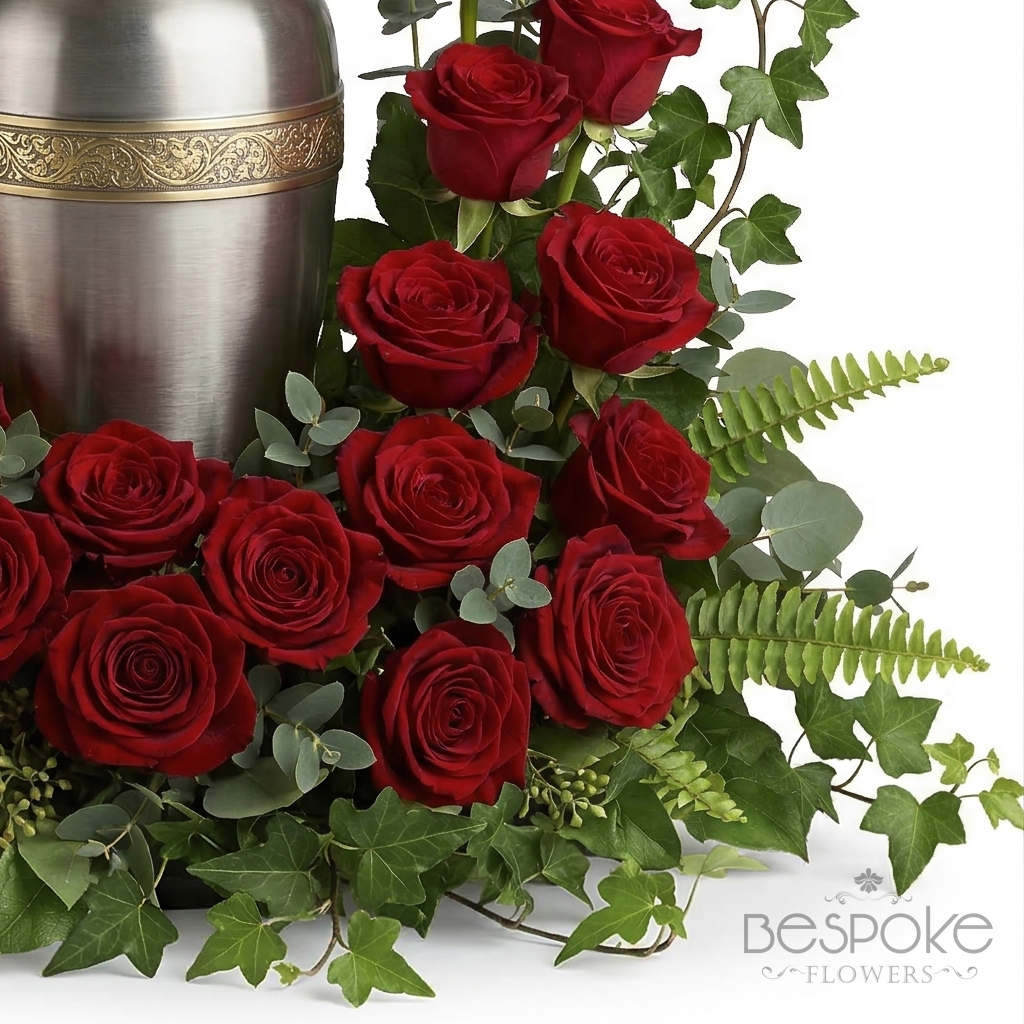 This elegant urn tribute features a rich composition of velvety red roses, gracefully arranged with lush greenery including myrtle, ivy, sword fern, and eucalyptus. Designed to surround and honor the urn, this timeless arrangement offers a heartfelt expression of love, remembrance, and enduring connection. Its classic beauty and refined presence create a peaceful and meaningful focal point for memorial services or a comforting tribute for the home.