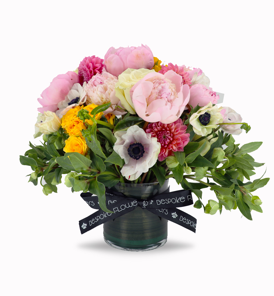 This beautiful arrangement features Dutch Peonies, Dutch Dahlias, Dutch helleborus, anemones, roses and spray roses. It’s crafted in a leaf lined cylinder vase.